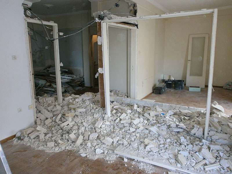Αποξυλώσεις / Κατεδαφίσεις Εκτελούμε αρχικά τις απαραίτητες αποξηλώσεις/καθαιρέσεις της κουζίνας, του μπάνιου, των κουφωμάτων, των ντουλαπών και των δαπέδων. Επιπλέον γίνονται αλλαγές στην διαρρύθμιση των χώρων με κατεδάφιση των μεσοτοιχιών που συνήθως απομονώνουν κάποιους σημαντικούς χώρους, όπως την κουζίνα.